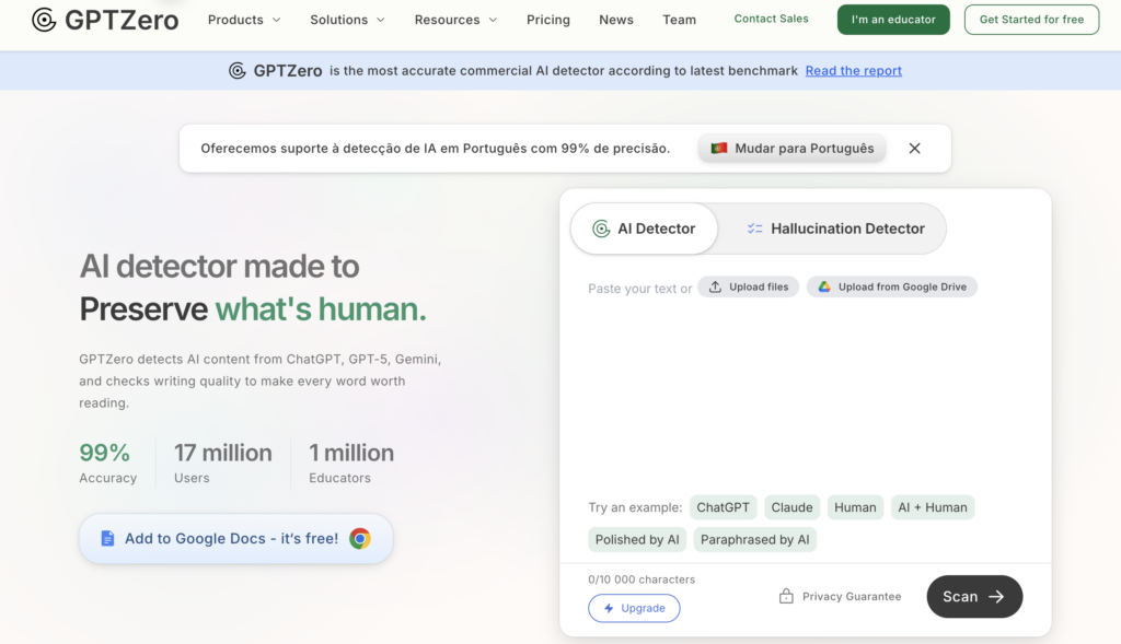 GPTZero is an online tool that detects whether a text was written by AI (ChatGPT, Gemini, etc.) or by a human.