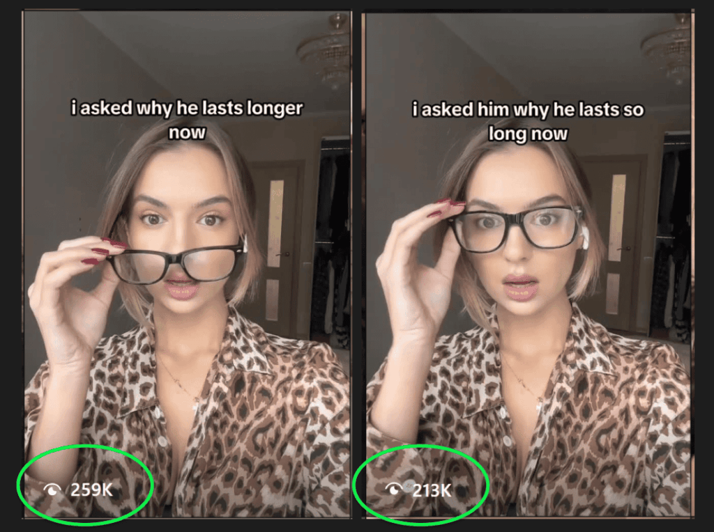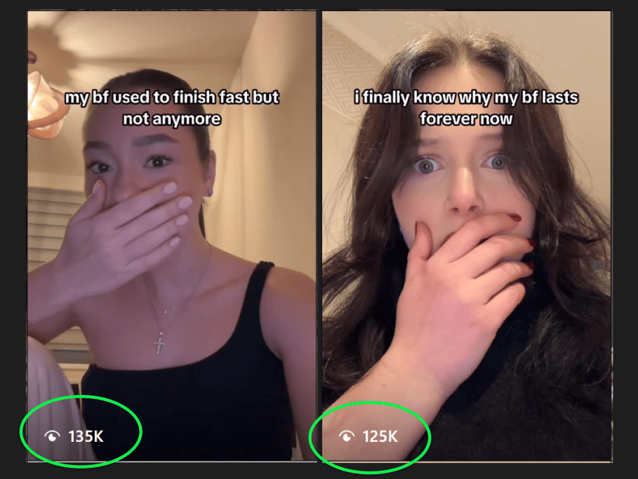 It is cheap to make, easy to replicate, and gives the team endless room to keep testing new hooks around the same anxiety. The videos may look rough, but the core mechanic is strong: a reaction that implies a sexual-performance shift, followed by a quick app reveal.