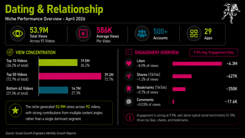 Engagement across the niche is strong, with 9.17M total interactions across 94M views, resulting in an average engagement rate of 9.7% at the higher end of typical short-form benchmarks.