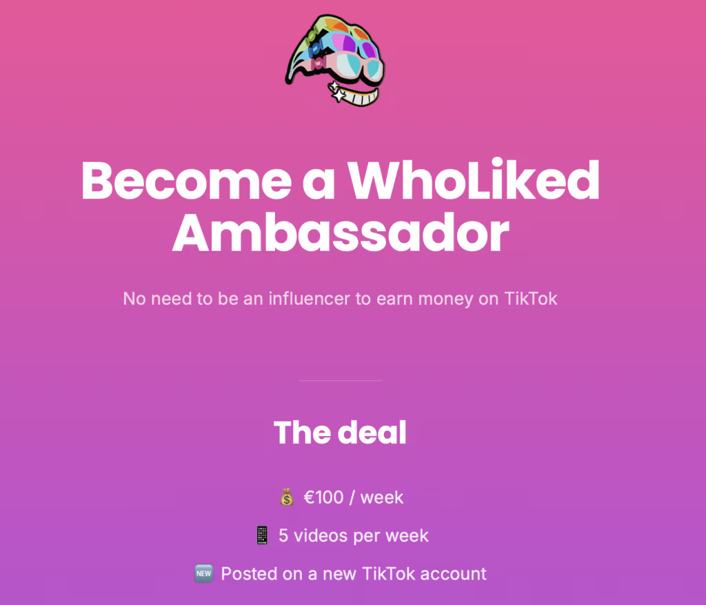 WhoLiked is scaling through a structured creator program that pays people to open fresh TikTok accounts and post a highly repeatable social game format.