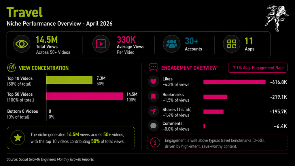 Over the last 30 days, the travel niche generated 14.5M views across (330K average views per video), published across a small but active set of tracked apps.